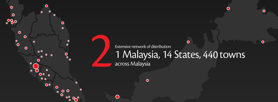 • Extensive networks of distribution – 1 Malaysia, 14 states, 440 towns across Malaysia.